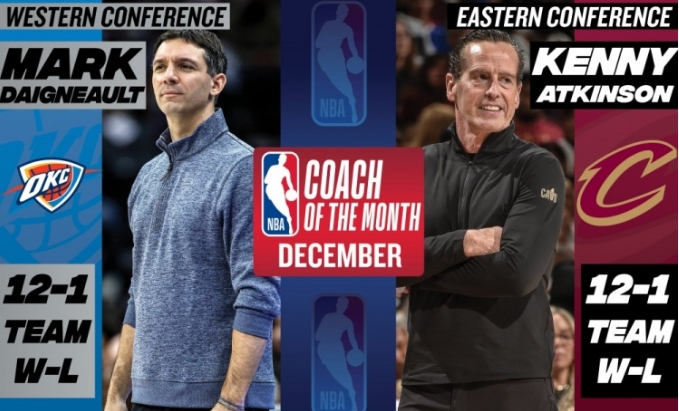 1 月 3 日讯,今日 NBA 官方重磅宣布,在刚刚过去的 12 月,雷霆主帅戴格诺特与骑士主帅阿特金森脱颖而出,分别荣膺西部和东部联盟月度最佳教练,这一消息如同冬日里的一把烈火,瞬间点燃了整个联盟的热情,引发各界广泛关注与热议。